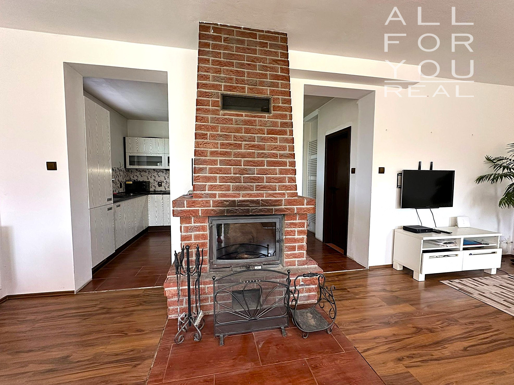 Spojená obývacia izba s kuchyňou je prepojená širokým vstupom okolo krbu priamo do jedálne