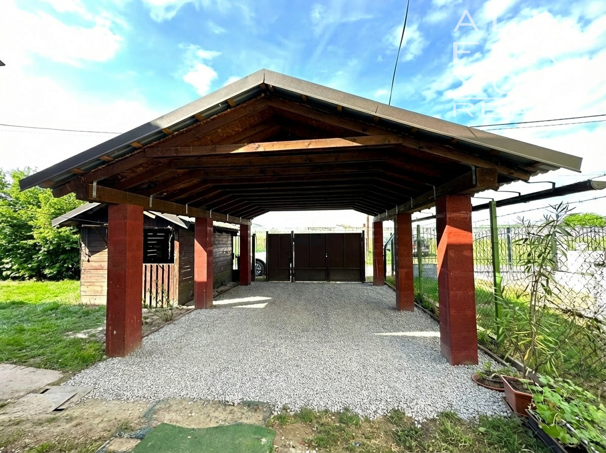 dom, prístrešok na auto a záhradný domček lokalizovaný v jednej časti pozemku